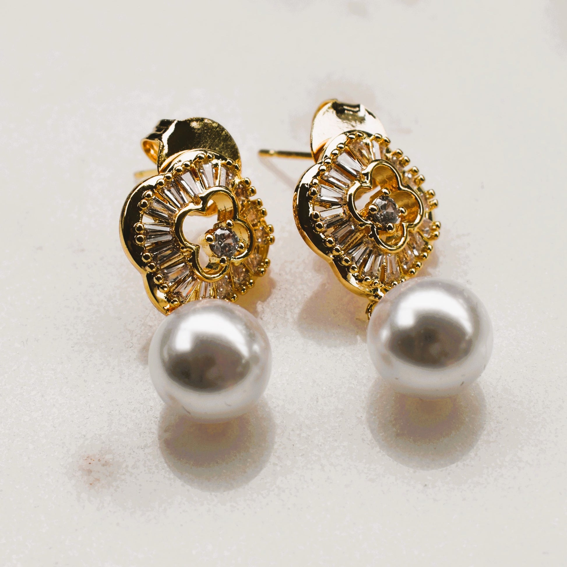 These elegant earrings feature a gold-tone floral motif adorned with sparkling baguette-cut and round-cut crystal accents, adding a radiant touch. Suspended below is a lustrous faux pearl drop, creating a classic yet glamorous look. Perfect for weddings, evening events, or adding a sophisticated finish to your everyday style.