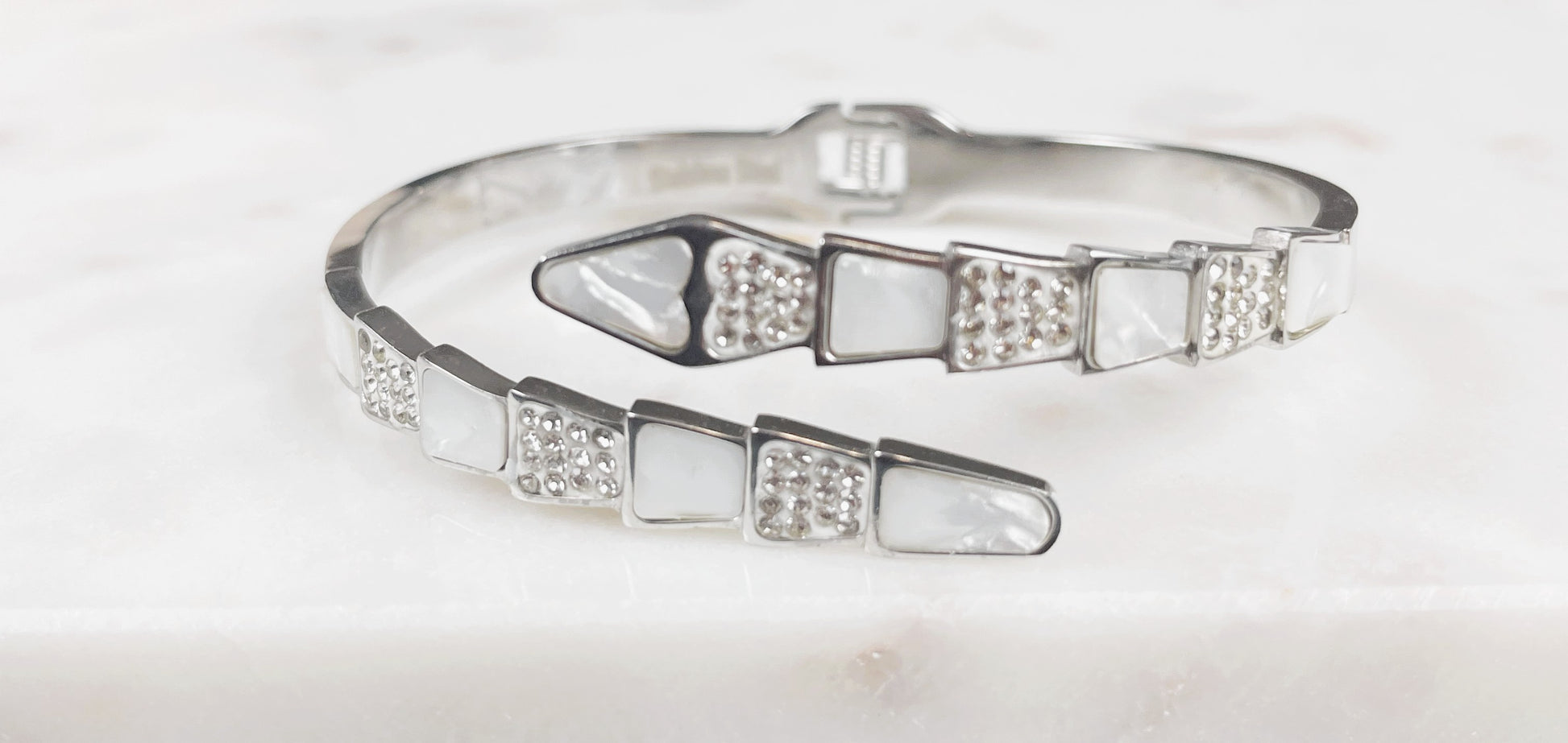 Elegant and modern, this open bangle features alternating panels of lustrous mother of pearl and sparkling crystal inlays, creating a refined geometric pattern. Available in both gold and silver tones, its sleek design and hinged closure ensure comfort and easy wear. A versatile piece that adds a touch of sophistication to any outfit, perfect for both casual chic and formal occasions.